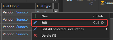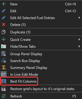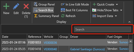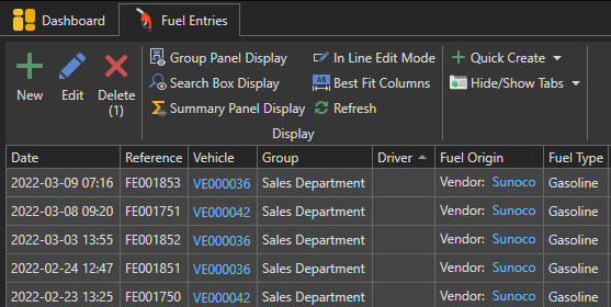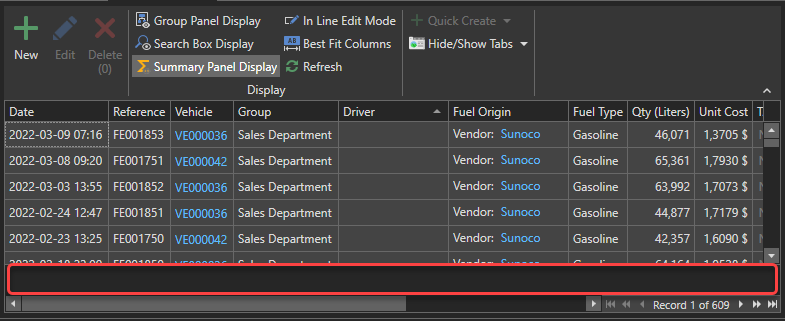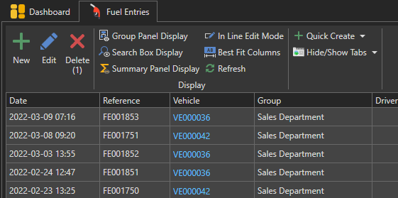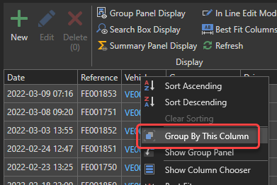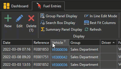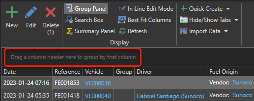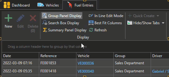 The grouping panel allows you to group the data of the grid by adding one or more columns to it. For example, when the grouping panel is displayed, you can group the Fuel Entries list by vehicle by dragging and dropping the "Vehicle" column header into the grouping panel: