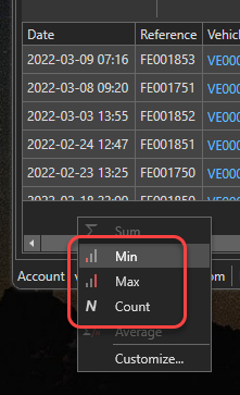 The summary panel allows you to display an aggregation of the column data by right-clicking in the summary panel under the desired column and then selecting an aggregation formula. For example, for a column containing data of the "Date" type, you choose the "Min", "Max" and "Count" aggregations, allowing you to display respectively the smallest date ("Min"), the largest date ("Max") or the number of dates ("Count") displayed in the column: