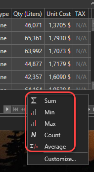 For a column with numeric data, the "Sum" (the sum of the column data) and "Average" (the average of the column data) functions will be available, in addition to the functions described previously: