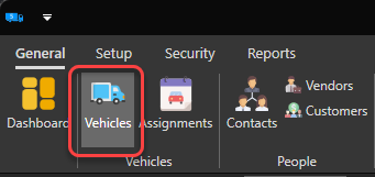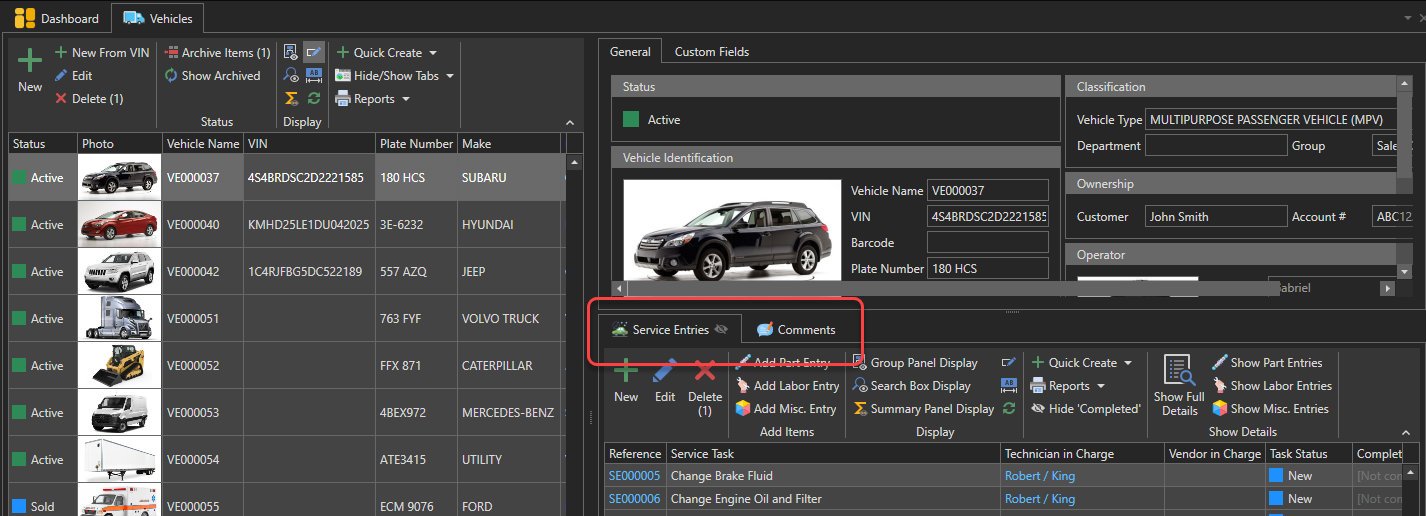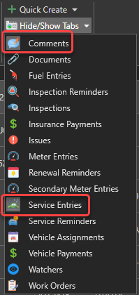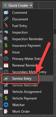 The Quick Create drop-down menu allows you to add a "child" item to the item currently in focus in the data grid. For example, to quickly add a service entry (the child) to a vehicle (the parent), go to the vehicle grid, click on the "Quick Create" button and click on the "Service Entry" menu: