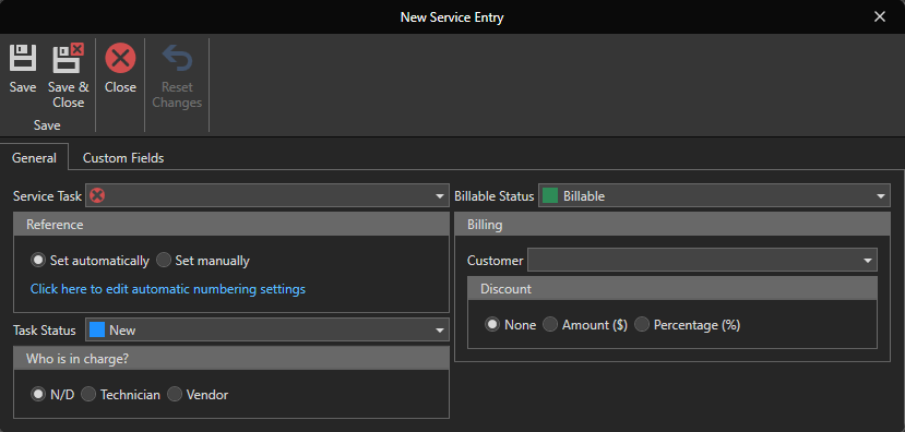 An empty service entry form will open, allowing you to enter the information for the new service entry then save it: