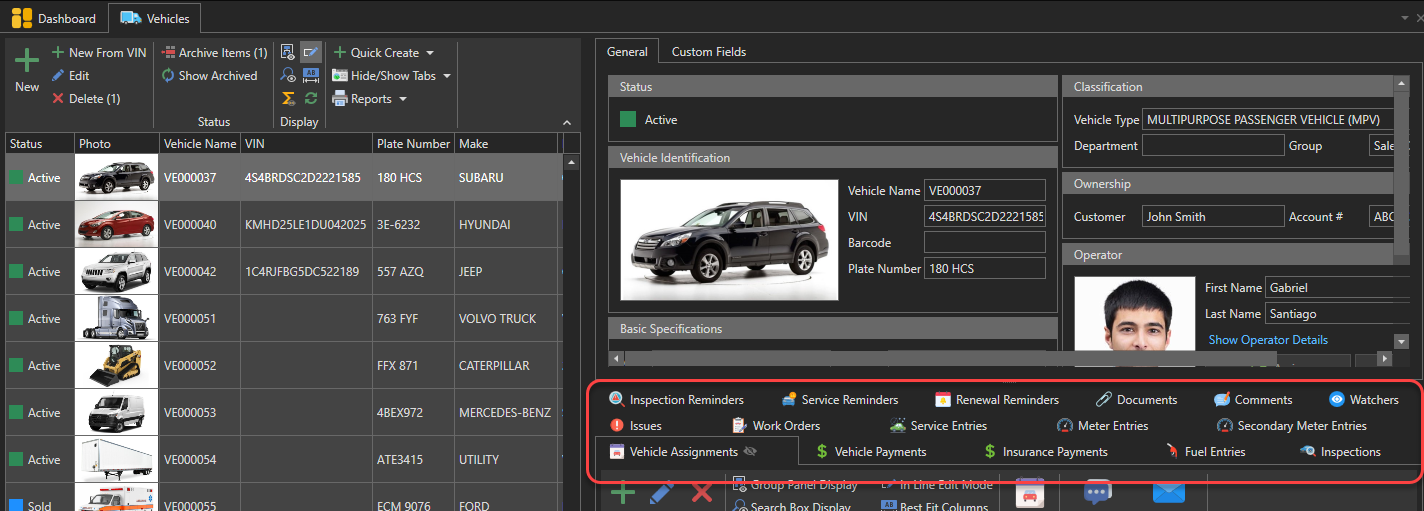 When "child" grids are associated with the main grid (the parent), the "Hide/Show Tabs" drop-down menu allows you to show or hide the tabs containing the child grids that you do not need to display. This improves the loading performance of the main grid, in addition to "decongesting" the interface. Take for example the vehicle section: