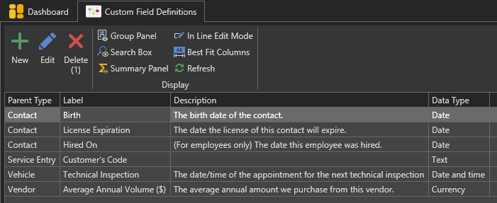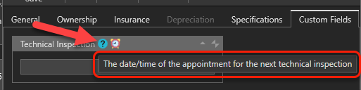 So for example, if you select "Vehicle" as the type of parent, then the custom field definition you will create will be available in the "Custom Fields" tab of the Vehicle's form: