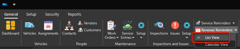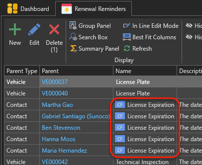 The "Renewal Reminders" view will appear. The renewal reminders having a little purple square with "CF" inside indicates that they are bound to custom fields: