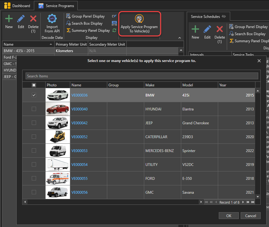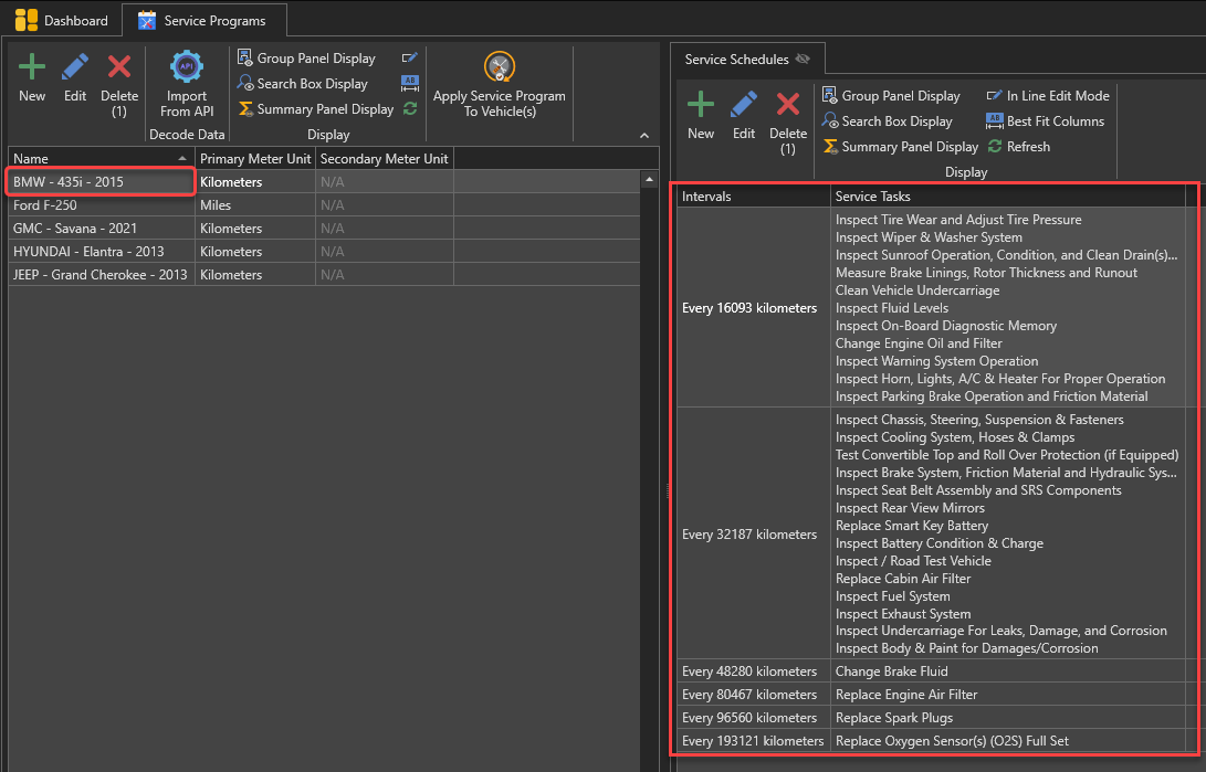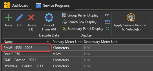 The list of service programs will appear. Select the service program containing the service tasks you want to create service reminders from. For our example, we will use the "BMW - 435i - 2015" service program: