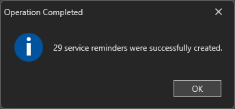 For our example, we will select the vehicle "VE000036". Press "OK" to validate. The following message will appear to confirm that the 29 maintenance reminders have been created:
