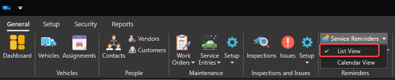 Now go to the service reminders window to check that the new service reminders are there. To access the service reminder management window, in the "Reminders" section of the "General" tab, click on "Service Reminders" then on the "List View" menu: