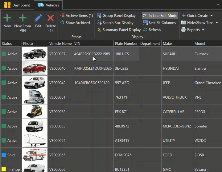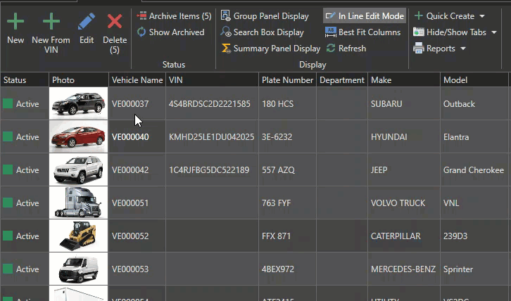 Select the vehicles you want to edit in the grid. To select a range of items, click on the first item in the range, hold down the Shift key, then click on the last item in the desired range. To add an item to the selection, hold down the Ctrl key then click the item to add to the selection:
