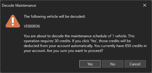As indicated in the message, decoding a vehicle's maintenance reminders via the API requires 30 decoding credits. Press "Yes" to confirm and proceed with the import.