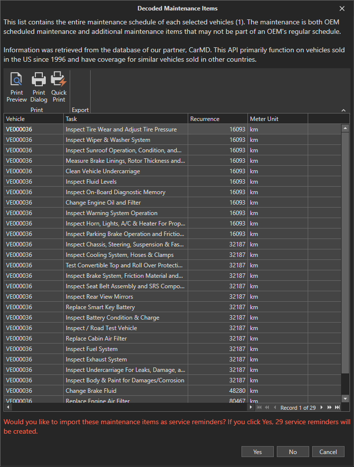 If the API finds the information for the selected vehicle, the list of decoded service tasks will be displayed in a window similar to this and you will be asked to confirm that you want to create service reminders corresponding to the service tasks decoded: