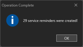 Press "Yes" to confirm the creation of service reminders. The following message will appear to confirm that the 29 service reminders have been created: