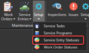 To access the service statuses management window, in the "Maintenance" section of the "General" tab, click on "Setup" then on the "Service Entry Statuses" menu: