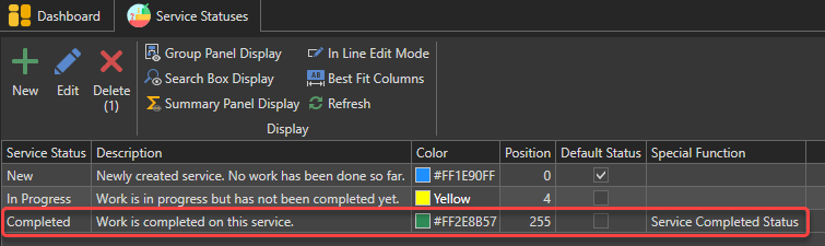 The list of service statuses will appear. You can add, modify or delete service statuses: