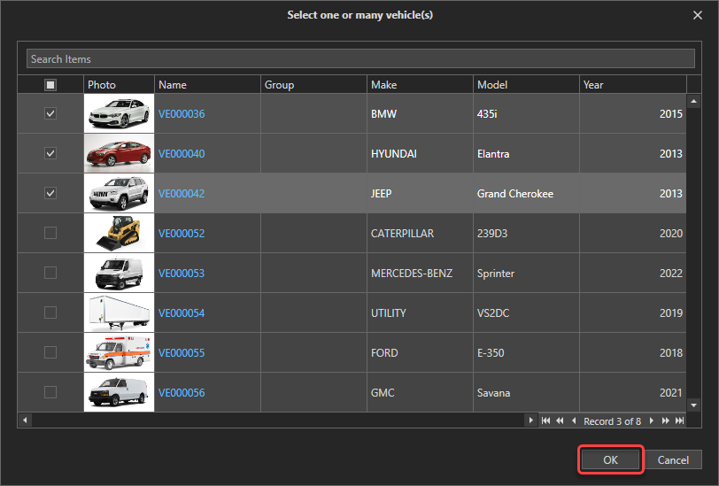 The list of vehicles will appear. Select the vehicles for which you want to import the service programs then press "OK":