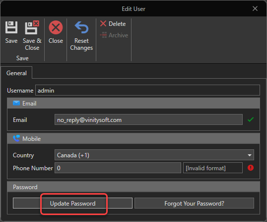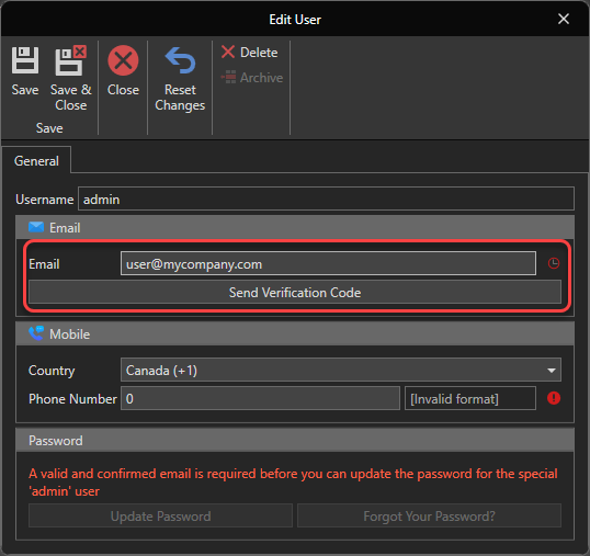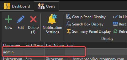 By default, a user named 'admin' is created in the database when the application is first opened. This user has full access to all application features and cannot be deleted. The default password for this user is empty and no email address is associated with it. We recommend that you associate a valid email address and password with the 'admin' user as soon as possible.