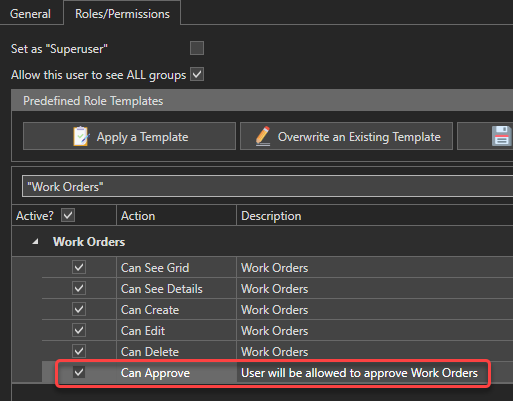 Pending Approval: The work order is ready and has been submitted for approval. It is awaiting approval by a user. A user must have the "Work Order - Can Approve" role to be able to approve a work order. You can modify the roles of a user via the user form: