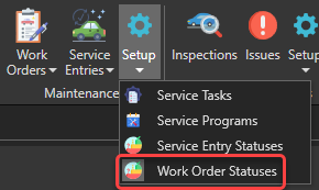To access the work order statuses management window, in the "Maintenance" section of the "General" tab, click on "Setup" and then on the "Work Order Statuses" menu: